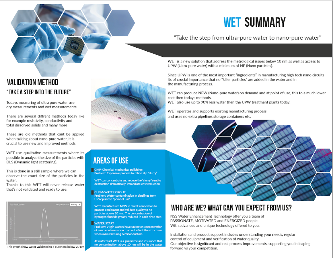 WET (Water Enhancement Tool) can produce nanopure water totally free of ANY contaminations above 5-10 nanometers, our nanopure water is 1000 times more pure then todays type 1 water AND the use of water in a semiconductor factory can be reduced with up to 90%.