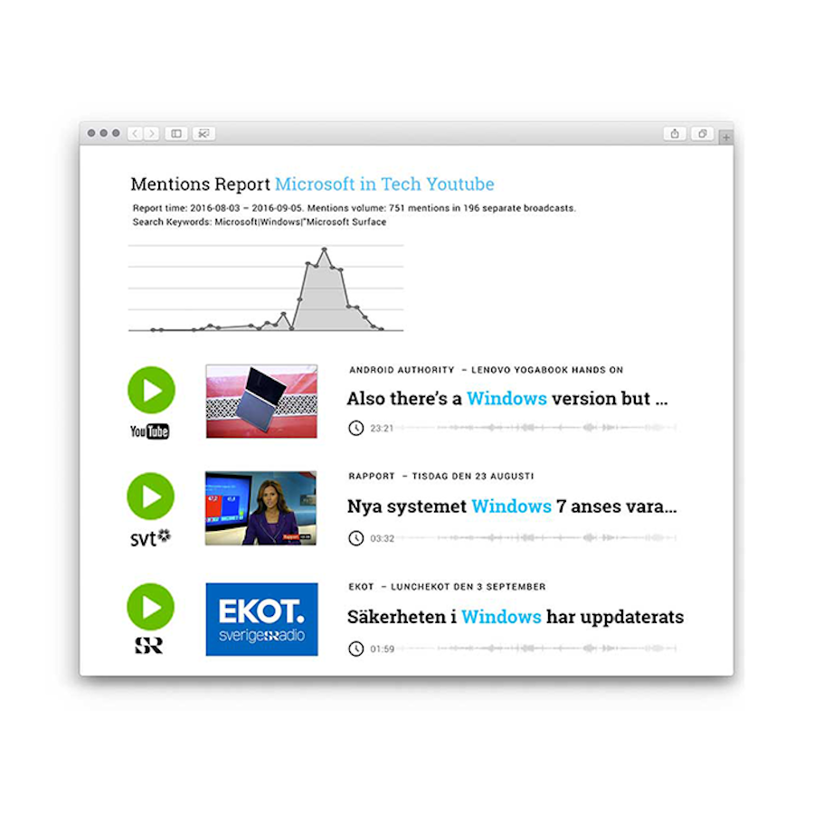 Varje dag publiceras hundratals timmar innehåll i svenska radiosändningar, poddar, Youtube-kanaler och på TV. Under ett dygn hinner tusentals varumärken att omnämnas.Vi använder maskininlärning och AI för att analysera vad som sägs i podcasts, radio, Youtube och TV-kanaler automatiskt – på massiv skala. Dessutom använder vi avancerad textanalys och tar vi reda på varför och i vilka sammanhang sökorden nämns, för att hjälpa användarna ta viktiga beslut i sina organisationer baserat på datan.